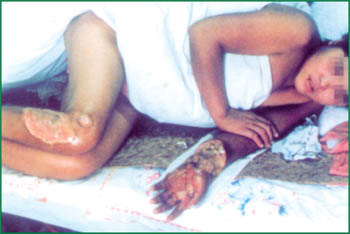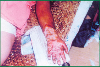 1、 該病例為電擊傷,手腕、前臂部位嚴(yán)重?fù)p傷。手腕前肌肉群全部壞死,尺橈動(dòng)脈壞死,骨間動(dòng)脈尚存活,上肢壓疼點(diǎn)至肘部。