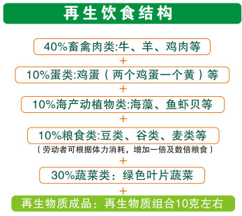 根據(jù)細(xì)胞培養(yǎng)獲得的人體細(xì)胞生長所需的營養(yǎng)比例,我們根據(jù)這個(gè)營養(yǎng)成分的比例關(guān)系,制定了人的每頓飯的食物組合,簡稱4:1:1:1:3,即:肉類40%,蛋類10%,海產(chǎn)類10%,糧食10%,蔬菜30%,詳見下圖: