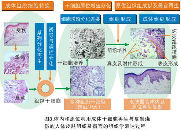 人類組織與器官體內(nèi)和原位再生、復(fù)制的圖譜具有代表性,而不同的組織器官有各自的圖譜,我們將于近期公布。圖3顯示的是燒傷的人類皮膚組織器官體內(nèi)和原位利用干細(xì)胞再生和復(fù)制的組織學(xué)表達(dá)過(guò)程。