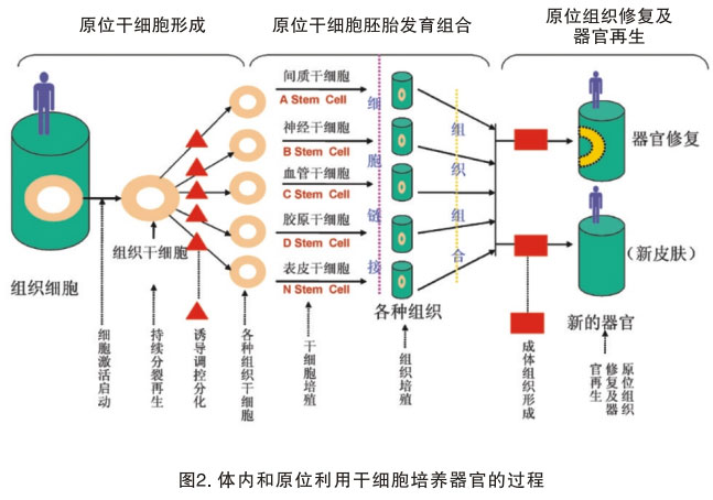 燒傷再生療法是目前唯一能在體內(nèi)和原位培養(yǎng)干細(xì)胞來(lái)成功修復(fù)與克隆器官的技術(shù)。相信該技術(shù)能盡早揭開人類生命體延續(xù)之謎。繼成功克隆人體最大器官皮膚后,其他器官的克隆過(guò)程將很快被證實(shí)。2002年5月28日,我公布了一項(xiàng)研究成果,人類組織器官再生復(fù)制圖譜,并申請(qǐng)了專利。美國(guó)網(wǎng)站www.stemcellresearchnews.com對(duì)這一重大事件做了大篇幅報(bào)道。圖譜客觀地再現(xiàn)了細(xì)胞修復(fù)損傷組織,的確是分化和整合的過(guò)程。第一,機(jī)體受傷,存活細(xì)胞原位啟動(dòng),形成成體干細(xì)胞。第二,成體干細(xì)胞被誘導(dǎo)并定向分化為各種組織的干細(xì)胞,將最終完成組織修復(fù)。第三,新生組織產(chǎn)生,再生的組織干細(xì)胞與新生組織連接。最后,各種新生組織組合成器官受損部分,形成新的功能組織器官,進(jìn)而實(shí)現(xiàn)體內(nèi)和原位靶組織器官的修復(fù)與再生(圖2)。