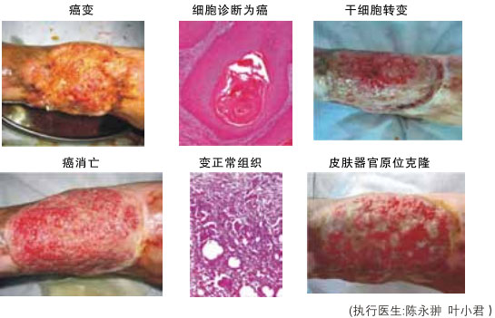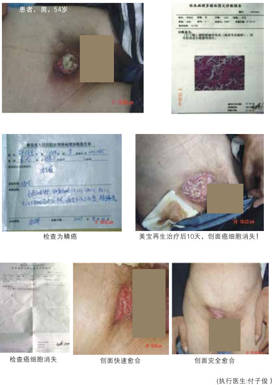 (5)人體癌組織原位試驗結(jié)果:選皮膚鱗癌做試驗對象,先將癌組織表面的壞死組織清楚,暴露新鮮成活的癌組織,而后外敷再生物質(zhì),每日早晚更新一次,21天后,皮膚癌創(chuàng)面癌細胞消失,而后皮膚愈合。
