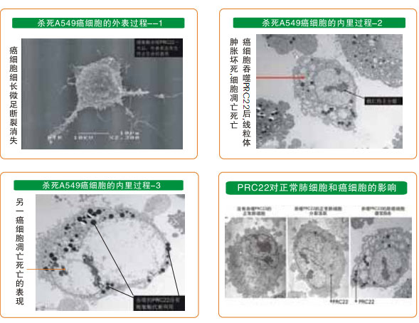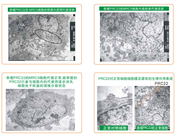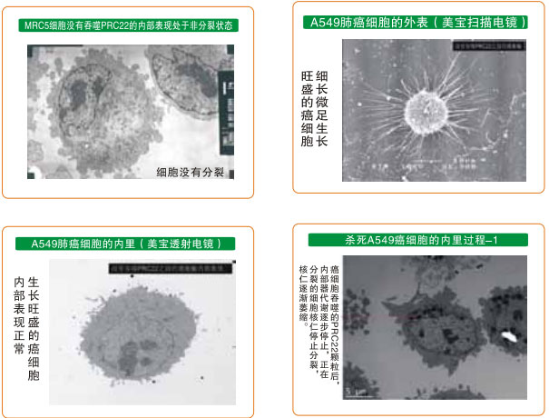 在獲得再生物質(zhì)對癌細胞生命作用研究結(jié)果的基礎(chǔ)上,我們選人胚肺MRC5細胞作為正常細胞,人肺癌A549細胞作為癌細胞,用人肺組織的再生營養(yǎng)物質(zhì)作為試驗物質(zhì),對正常細胞和癌細胞進行體外培養(yǎng),觀察再生物質(zhì)進入細胞內(nèi)是如何產(chǎn)生作用的。其結(jié)果為,正常細胞吞入再生物質(zhì)后,細胞內(nèi)的各個器官代謝旺盛,細胞核分裂表現(xiàn)活躍,再生物質(zhì)在細胞內(nèi)被代謝消耗;沒有加入再生物質(zhì)培養(yǎng)的正常肺細胞對照組的細胞,沒有產(chǎn)生明顯的增殖變化。而肺癌細胞吞入再生物質(zhì)后,細胞內(nèi)各器官代謝立即停止,第一天,細胞自斷偽足,細胞內(nèi)的線粒體腫脹死亡,細胞核仁萎縮,吞入的再生物質(zhì)沒有發(fā)生代謝消耗性反應(yīng),第二天后細胞凋亡性死亡,吞入的再生物質(zhì)完好無損。如此的試驗結(jié)果認為,再生物質(zhì)對正常細胞內(nèi)各器官的作用是一種再生營養(yǎng)素,而對于癌細胞內(nèi)的器官則是致死性物質(zhì)。試驗結(jié)果還表明,再生物質(zhì)的作用首先發(fā)生在細胞質(zhì)內(nèi)的器官中,而后影響細胞核內(nèi)。這樣的結(jié)果所見可能是人類攻克癌癥的一個嶄新途徑。(參見下列系列電鏡圖片)