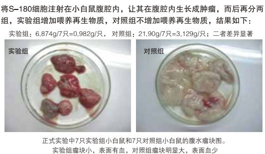 將S-180細胞,注射到小白鼠腹腔內(nèi),讓其在腹腔內(nèi)形成腫瘤組織,在形成一定大小時分為兩組,一組增加一定量再生物質(zhì)的喂養(yǎng)(實驗組),一組不加再生物質(zhì)喂養(yǎng)(對照組)。一段時間后,將小白鼠腹腔內(nèi)的腫瘤組織取出,進行稱量,喂養(yǎng)再生物質(zhì)組的小白鼠腫瘤組織塊明顯地小于沒有喂養(yǎng)再生物質(zhì)組小白鼠腹腔內(nèi)的腫瘤組織塊,數(shù)據(jù)是:實驗組0.982g/只,對照組3.12g/只,且腫瘤組織的顏色外觀明顯不同。