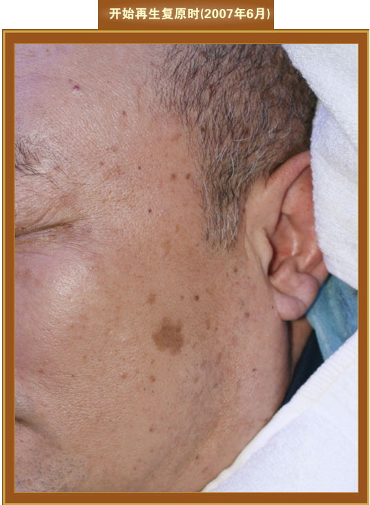 一個(gè)衰老色斑皮膚,經(jīng)過三個(gè)月皮膚再生復(fù)原技術(shù)的養(yǎng)生,色斑減退或消失,色素組織消失,皮膚再生復(fù)原為年輕狀態(tài)。
