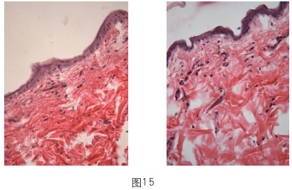 我們做了大白鼠試驗(yàn),喂養(yǎng)的兩批老鼠都是300天的成年白鼠,一組吃膳素,10%的;一組對(duì)照,同樣的量喂養(yǎng),喂到826天,喂再生物質(zhì)的這組除去兩個(gè)拉肚子死亡的,剩下都活著。  而對(duì)照的那一組,只有一只活到826天,其他都在550天左右死亡。把所有臟器做組織切片(圖15),試驗(yàn)組老鼠的皮膚