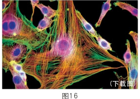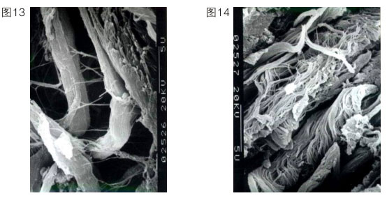 上述內(nèi)容說(shuō)明再生復(fù)原重要的是要恢復(fù)其皮膚正常的生理功能。正常人的皮膚衰老了,意味著他皮膚的很多功能缺失了或退化了。因此我們的皮膚再生必須控制細(xì)胞,讓細(xì)胞強(qiáng)壯,恢復(fù)正常生理功能。我們?cè)趯?shí)踐中就啟動(dòng)了角蛋白十九型干細(xì)胞,當(dāng)然也可以啟動(dòng)角蛋白十九型以下的細(xì)胞。我們首先把表皮基底層細(xì)胞啟動(dòng)起來(lái),使它可以增加生命活力,重建,同時(shí)成纖維細(xì)胞也更新。一個(gè)90歲的老人,基底細(xì)胞只有5%是有功能的。人一旦衰老了,細(xì)胞就難以再生到足夠的數(shù)量,所以一定要保證再生物質(zhì)的量,確保細(xì)胞的功能。一般來(lái)說(shuō),成纖維細(xì)胞的功能,隨著年齡的增長(zhǎng)會(huì)代謝低下,這個(gè)低下指的是產(chǎn)生纖維的速度減慢、產(chǎn)生的量減少,產(chǎn)生的膠原纖維不成束。一個(gè)正常細(xì)胞產(chǎn)生的纖維如左圖所示(圖13),一個(gè)衰老的細(xì)胞產(chǎn)生的纖維如右圖所示。(圖14)這個(gè)衰老的細(xì)胞產(chǎn)生的絲是雜亂無(wú)章的,沒(méi)有彈力,又散又少。人老了,在細(xì)胞里產(chǎn)生的原纖維