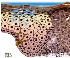 世界上化妝品無(wú)論配方如何,這些外源性化妝品都很難進(jìn)入到真皮。之所以這么說(shuō),是因?yàn)樵诨准?xì)胞層下面有一個(gè)膜(圖7),這個(gè)膜不僅是為了表皮與真皮的連接,這也是解決皮膚器官再生復(fù)原的一個(gè)最重要的技術(shù)環(huán)節(jié)。這個(gè)基底膜具有半通透性,在皮膚和斷指再生治療技術(shù)上,我們仿生了這個(gè)膜,這層膜的下面有血管、神經(jīng),但血管過(guò)不了這層膜。如果你的皮膚一旦出血,就說(shuō)明是這層膜破了。我們看到的血絲,都是在基底膜之下的,除非異常的血絲,有些病變的可以突出到基底膜之上。正常的生理情況下,血管都在基底膜下,膠原纖維也在基底膜下,纖維無(wú)法通過(guò),唯一能通過(guò)的是神經(jīng)末梢。(圖8)神經(jīng)延伸到基底膜,基底膜外面還有一層膜包繞在神經(jīng)外面,一但穿過(guò)了這個(gè)膜就成了沒(méi)有膜包繞的纖維,叫神經(jīng)纖維的暴露端,所以膜上面除去表皮的四大層,還有一些無(wú)包膜的神經(jīng)末梢纖維。因此觸摸的時(shí)候會(huì)出現(xiàn)感覺(jué)。