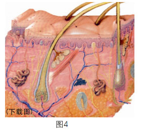 對(duì)于以上這些結(jié)論我們非常有把握,因?yàn)槲覀冇?0多年的皮膚再生臨床經(jīng)驗(yàn)。美寶濕潤(rùn)燒傷膏并不是一下子就研究出來(lái)的,從開(kāi)始的創(chuàng)面濕潤(rùn)到一般的創(chuàng)面愈合,接著到深二度減少疤痕愈合,再到深二度愈合無(wú)疤痕,而后又發(fā)展到三度燒傷能愈合有疤痕,再到三度燒傷愈合無(wú)疤痕,以后又進(jìn)展到不僅僅是皮膚燒傷,而且傷及到肌肉骨骼,都能夠?qū)崿F(xiàn)皮膚再生,只要有骨頭在,就能使軟組織和皮膚再生出來(lái) ,這么一步一步走過(guò)來(lái)的。所以,從皮膚的表面開(kāi)始,一步一步到最后實(shí)現(xiàn),用一個(gè)細(xì)胞復(fù)制再生出所有的細(xì)胞。在這個(gè)過(guò)程當(dāng)中我們已經(jīng)把整個(gè)皮膚器官再生出來(lái)了,并形成了皮膚缺損如何再生的理論和技術(shù)。然后再思考正常的皮膚如何再生,正常皮膚的毛細(xì)血管有一些帶有半抗原性,或帶有特異排斥性質(zhì),一些物質(zhì)到毛細(xì)血管就被阻止了,無(wú)法進(jìn)入,只能通過(guò)淋巴系統(tǒng)被轉(zhuǎn)回,因此沒(méi)有辦法通過(guò)毛細(xì)血管的吸收來(lái)營(yíng)養(yǎng)細(xì)胞。皮膚和別的器官不一樣,有些帶類似抗原性質(zhì)的成分到達(dá)不了細(xì)胞,所以要結(jié)合外源性注入的方法,雖然外源性物質(zhì)導(dǎo)入量不大,但是都能夠被導(dǎo)入真皮層。(圖3)汗腺、皮脂腺、毛囊、毛發(fā)等實(shí)際上從胚胎時(shí)期就是由一個(gè)干細(xì)胞發(fā)育來(lái)的。表皮的基底細(xì)胞排得很整齊,看上去都是一個(gè)個(gè)的,實(shí)際上它們是連續(xù)的,皮膚表皮的上半部分都是靠基底細(xì)胞分化而來(lái)的?;准?xì)胞上面各層可以都沒(méi)有,但這層基底細(xì)胞必須存在,只要有這層細(xì)胞,皮膚的表面就會(huì)恢復(fù)得完好無(wú)損。醫(yī)學(xué)上常說(shuō)的皮膚的生理性再生就是指表皮基底細(xì)胞層再生的概念,只要這層細(xì)胞在,就能把表皮外面各層都再生出來(lái)。表皮的組成層次由深層到表層主要是基底層、棘層、顆粒層,最上面是角質(zhì)層。