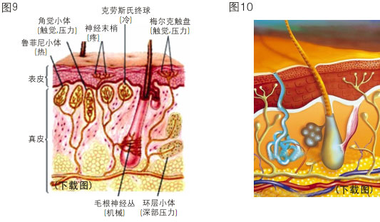 皮膚器官中的神經(jīng)組織主要是神經(jīng)纖維和各種神經(jīng)小體,具有接受刺激和傳導(dǎo)興奮的功能,是皮膚及皮膚附件活動(dòng)的功能單位。