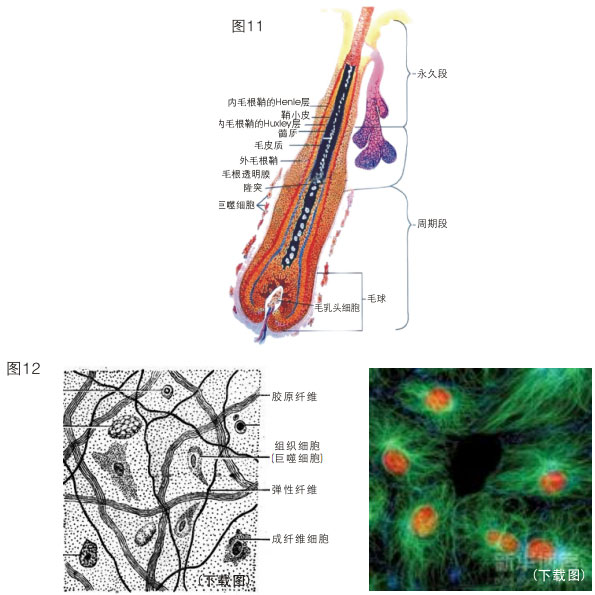 汗腺分泌細(xì)胞。毛囊細(xì)胞是從卵胚開(kāi)始的一個(gè)新的細(xì)胞,是一個(gè)獨(dú)立的家族。人的身上有三種毛:短毛、長(zhǎng)毛和毳毛,頭發(fā)為長(zhǎng)毛。從胚胎時(shí)期開(kāi)始,生長(zhǎng)毛發(fā)的細(xì)胞就有三個(gè)不同原發(fā)細(xì)胞,一個(gè)是長(zhǎng)長(zhǎng)毛的,一個(gè)是長(zhǎng)短毛的,一個(gè)是長(zhǎng)毳毛的,毳毛即汗毛。它們發(fā)生的時(shí)間不同,短毛和長(zhǎng)毛是來(lái)自于最原始的卵胚,而汗毛可來(lái)自于表皮干細(xì)胞,也就是角蛋白19型家族。所以大面積深度燒傷時(shí)愈合以后都能長(zhǎng)汗毛,但長(zhǎng)不了長(zhǎng)毛也長(zhǎng)不了短毛。在這里也告訴大家,對(duì)付脫發(fā)應(yīng)該在人還沒(méi)有脫落頭發(fā)前加以控制,不讓頭發(fā)脫落,一旦毛乳頭全脫落了就長(zhǎng)不出頭發(fā)來(lái)了,能長(zhǎng)出的不過(guò)是類似于短毛的一些毳毛(圖11)。這是因?yàn)樵谠偕鷷r(shí),毛發(fā)是利用毛發(fā)里邊儲(chǔ)存的信息機(jī)關(guān)——隱窩來(lái)再生的,毛隱窩里儲(chǔ)存有短毛和毛干的信息,任何皮膚里面都有這種信息。由于人的進(jìn)化造成有些部位不長(zhǎng)毛,有些長(zhǎng)毛,這個(gè)毛隱窩是由于人的進(jìn)化所形成的,但種族不同,毛隱窩則有所不同,就像美國(guó)人身上有很多毛,但那也是短毛而不是長(zhǎng)毛。咱們亞洲人皮膚比較平滑,棕色人、黑人也比較平滑,是因?yàn)殡[窩比較弱,不長(zhǎng)那么長(zhǎng)的毛。我們?cè)芯窟^(guò)怎么能讓光禿頭頂長(zhǎng)出細(xì)毛,當(dāng)初我們把每個(gè)細(xì)胞都拿出來(lái),看是哪一種細(xì)胞長(zhǎng)的,發(fā)現(xiàn)都是毛隱窩長(zhǎng)的。雖然一旦失去了毛囊就不能再長(zhǎng)頭發(fā)了,但是只要毛隱窩還在,就還有長(zhǎng)毛的功能,每一個(gè)隱窩都能長(zhǎng)出一個(gè)毳毛來(lái)。社會(huì)上某些生發(fā)產(chǎn)品就是刺激這個(gè)隱窩的細(xì)胞,但這種刺激所長(zhǎng)出的毛很脆弱,一碰就掉了,一旦沒(méi)有刺激作用了,這毛發(fā)就不長(zhǎng)了。我們?cè)跓齻委熤幸舶l(fā)現(xiàn),只要有皮膚產(chǎn)生就有毳毛,當(dāng)然手掌除外,手掌是沒(méi)有毳毛的,這是遺傳的特性。有人問(wèn)男性的胡須是什么毛?這個(gè)毛有短毛的種類,也有長(zhǎng)毛的種類,主要是長(zhǎng)毛種類。
