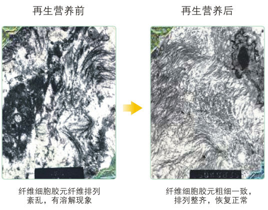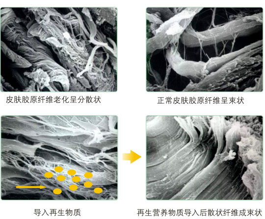● 吸收的再生營(yíng)養(yǎng)物質(zhì)促使已經(jīng)存在的衰老散狀纖維絲成束,恢復(fù)真皮的彈力和豐滿(mǎn)度。