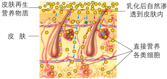再生營(yíng)養(yǎng)物質(zhì)乳化滲透皮膚內(nèi)示意圖