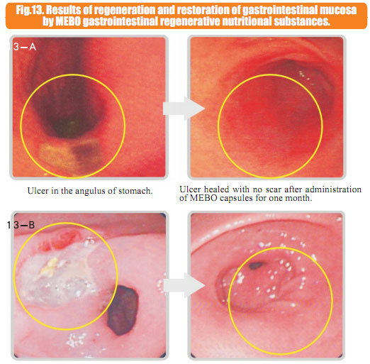 6.2 Gastrointestinal ulcers: At the present, the routine medical treatment is to repair the wound surface with scar formation, therefore resulting in recurrence and no healing.  Using our regenerative treatment in this research program, new gastrointestinal mucosa can be regenerated in situ from the ulcerous wound surface, and then replace the ulcerous wounds with no scarification, ulcers were healed completely.