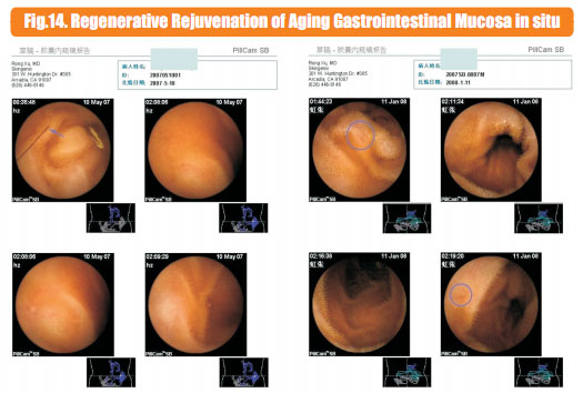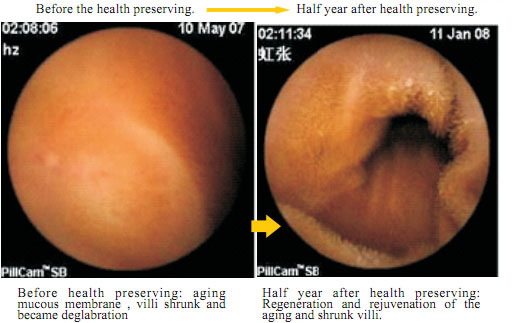 The aged gastrointestinal mucosa can return to status of young stage, no one could imagined it before from the point of view of medicine or health preservation, but our regenerative and restorative therapy in this project has solved it effectively.  It was suggested in our research that after 40 years old, human gastrointestinal mucosa enters the process of ageing, and the process begins earlier than any other organs; after 50 years old, about half of the human gastrointestinal mucosa will not function, entering a status of ageing and apoptosis; when at 90 years old, functional cells will be less than about 10% of the normal amount.