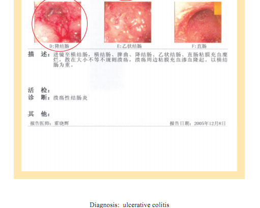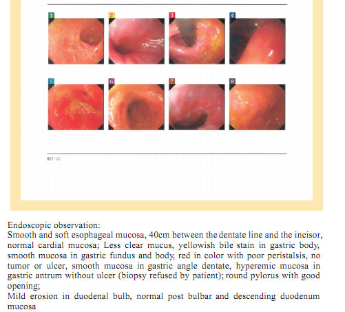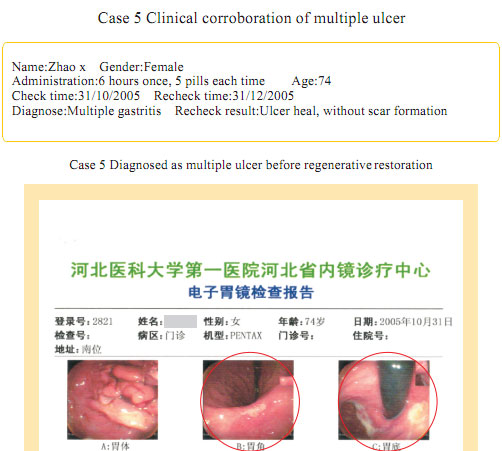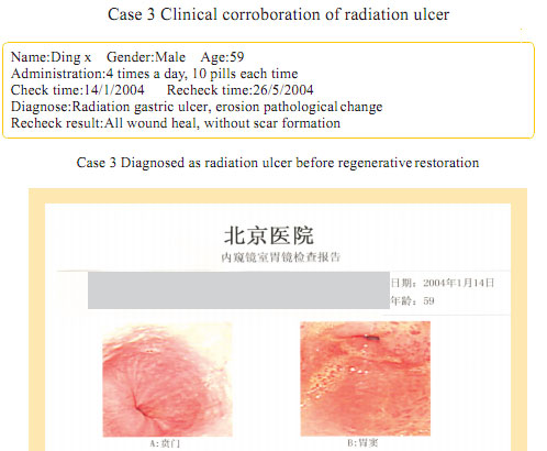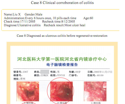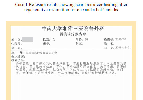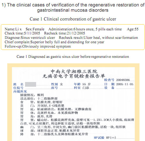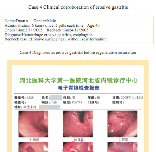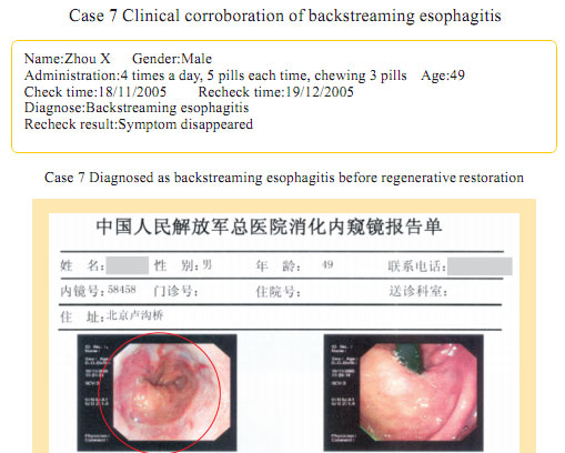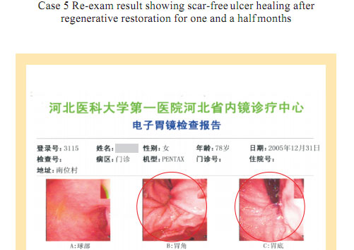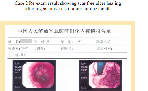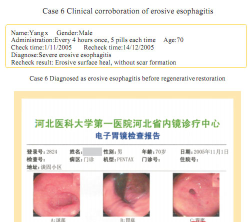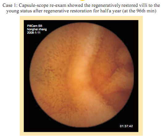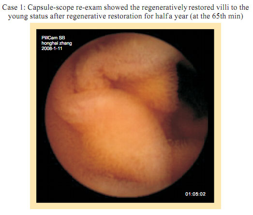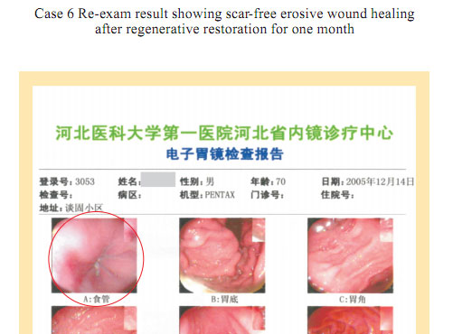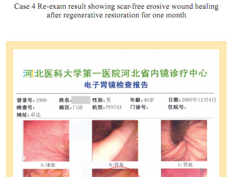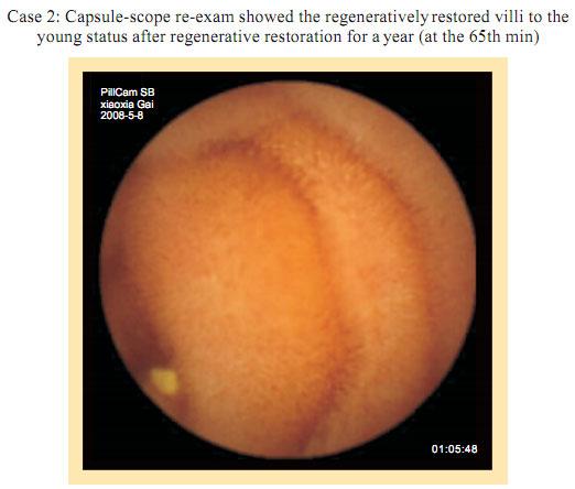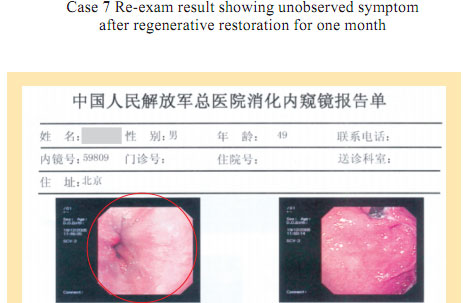 Case 1: Name: Zhang, Gender: Male, age: 56. He started the gastrointestinal regenerative restoration program from May 2007.After half year’s participation, the gastrointestinal system are mostly regenerated and restored and the physical signs of mucosa demonstrates younger state.