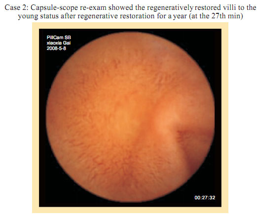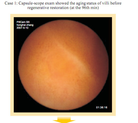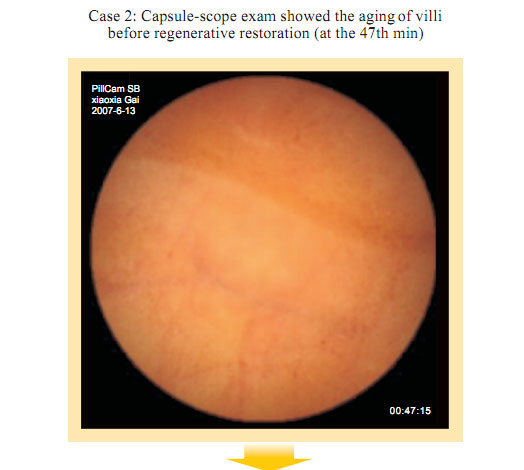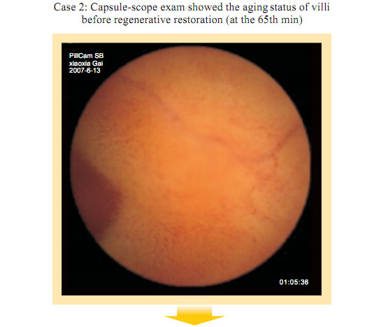 Capsule Endoscopy observation before gastrointestinal regenerative restoration: Atrophy, attenuation, the submucosal vascular net are obviously observed at the intestinal mucosa and the submucosa. Small villi are sparse, length shortened, degraded, villi in some area completely exfoliated. Fossae become shallow. The villi area becomes small. Gastrointestinal mucosal system presents the condition of aging.