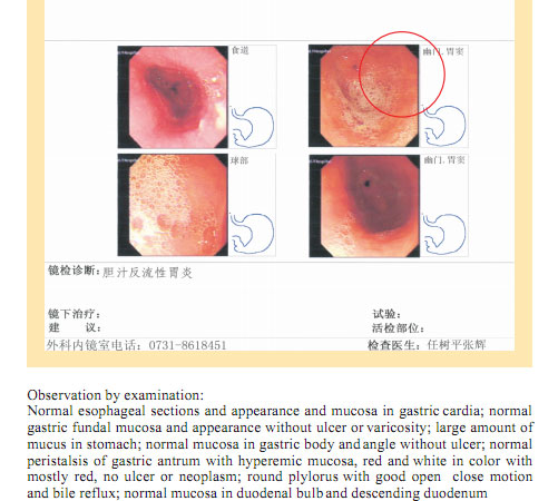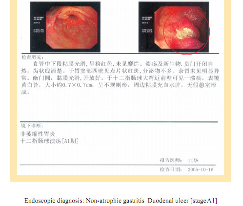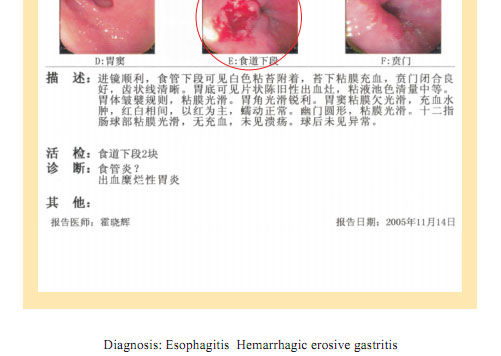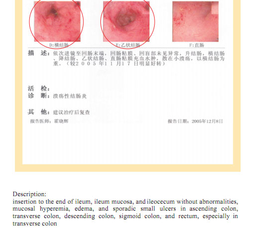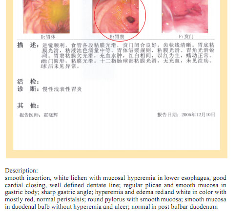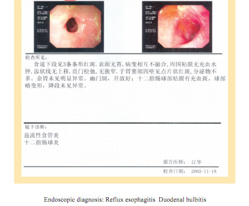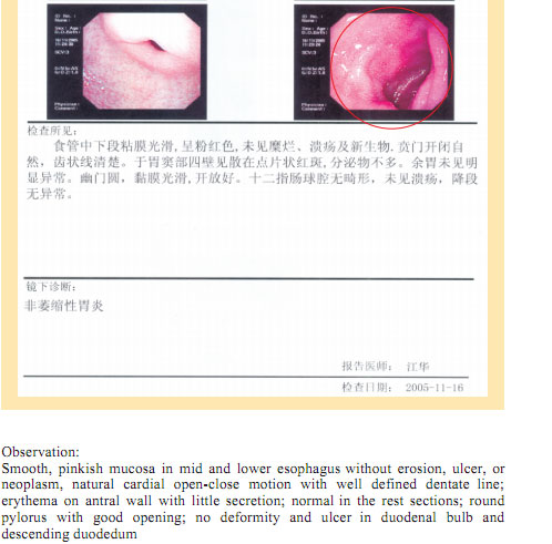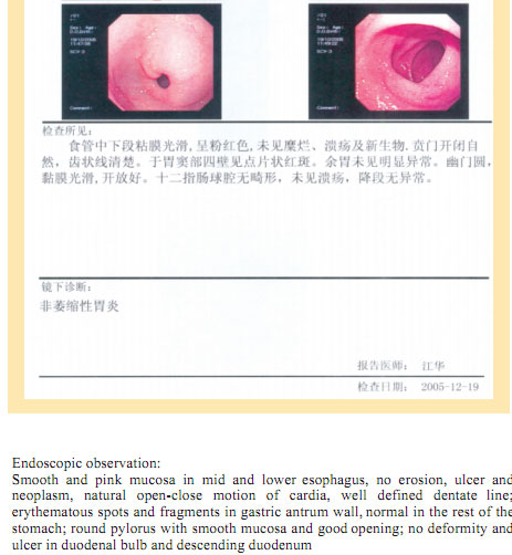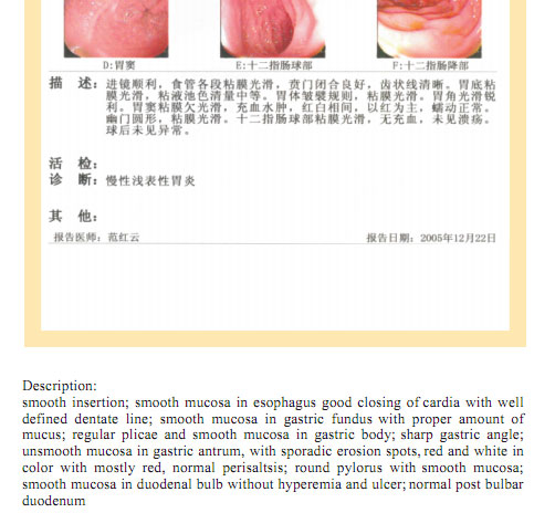 Name: Gai, Gender: Female, Age: 54. She started the gastrointestinal regenerative restoration program in June 2007.After one year’s treatment, the gastrointestinal system are mostly regenerated and restored, the physical signs of mucosa demonstrates young and healthy state.