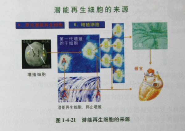 潛能再生細(xì)胞是與組織細(xì)胞在一起的、有潛能的、靜態(tài)的、原位性的和有干細(xì)胞再生功能的成體細(xì)胞(圖1-4-21)。