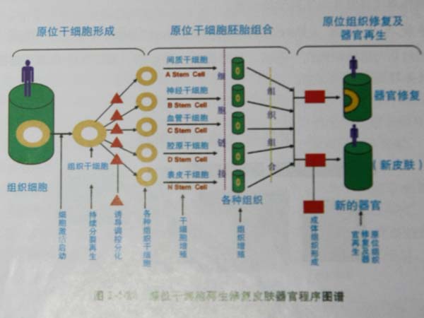 從原位干細(xì)胞再生復(fù)原皮膚器官程序圖譜中看出,皮膚原位再生復(fù)原技術(shù)包括三個(gè)方面:一是原位激活啟動(dòng)潛能再生細(xì)胞,促進(jìn)其形成干細(xì)胞;二是原位干細(xì)胞的組織組合;三是皮膚組織器官的再生組合。