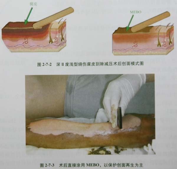(4)因搶救生命而不能及時腐皮刮除減壓術者,創(chuàng)面可先涂MEBO覆蓋保護,預防和減輕再次損傷。