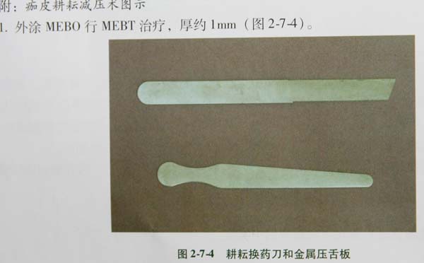 痂皮劃痕耕耘減壓術(shù)是指對(duì)深Ⅱ度深型創(chuàng)面用耕耘換藥刀耕耘燒傷創(chuàng)面壞死皮膚,減輕淤滯缺氧細(xì)胞壓力,促其恢復(fù)。深Ⅱ度深型創(chuàng)面殘存少量真皮網(wǎng)狀層細(xì)胞,淤滯帶已明顯生成,在MEBT/MEBO作用下,可以部分恢復(fù)生機(jī)。因壞死真皮組織已形成痂皮,經(jīng)過(guò)痂皮耕耘減壓術(shù)和MEBO治療,使部分壞死組織加速溶解脫落,創(chuàng)面在MEBO作用下,再生復(fù)原創(chuàng)面。