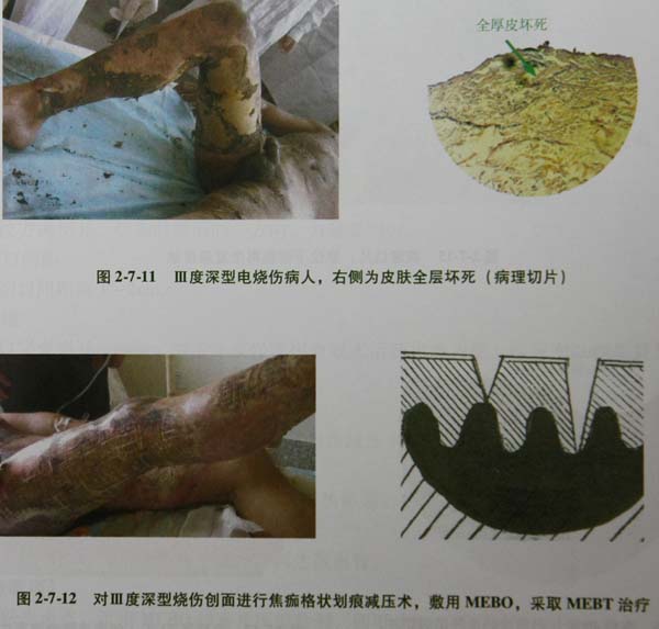 焦痂格狀劃痕減壓術(shù)是指對(duì)淺筋膜組織及皮膚壞死的Ⅲ度深型燒傷創(chuàng)面,采用普通手術(shù)刀在壞死皮膚表面做方格狀切劃耕耘減壓治療。