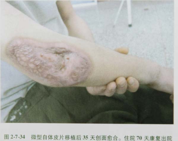 3)一般在1015天即可見暴露骨骼的鉆孔部位長出肉芽組織,此種肉芽組織在MEBO的作用下逐漸擴(kuò)展以至覆蓋暴露的骨關(guān)節(jié),術(shù)后2025天肉芽組織長滿,可行自體皮簇內(nèi)植術(shù)治療。此為關(guān)節(jié)擴(kuò)創(chuàng)肉芽培植術(shù)階段。對已經(jīng)植皮成活的創(chuàng)面繼續(xù)應(yīng)用MEBO外涂,可促進(jìn)皮片伸展愈合并可減輕疤痕的生成,保證肢體功能的恢復(fù)。