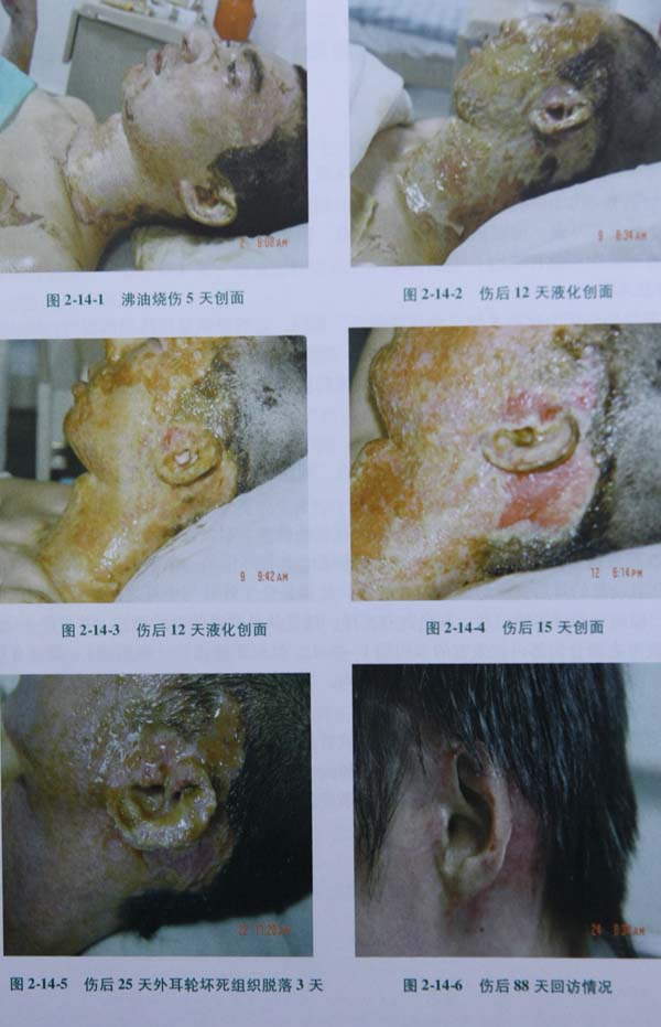 2141沸油燃燒致顏面部燒傷后5天,耳部逐漸出現(xiàn)液化,耳廓外輪蠟黃色,仍連接緊密,不急于清除;圖2142、圖2143燒傷后12天,耳廓周圍壞死頭皮液化排除,肉芽新鮮,耳廓液化佳,但連接仍緊密,換藥時僅清除液化物、多余藥物、松動壞死組織;圖2144燒傷后15天,外耳輪壞死組織浮起,但邊緣仍緊密連接;圖2145燒傷后25天,外耳輪壞死組織脫落3天,肉芽生長佳,新鮮,繼續(xù)常規(guī)治療;圖2146燒傷后88天,出院后回訪,滿意生理性愈合,持續(xù)美寶疤痕平軟膏治療,形成薄層軟疤。