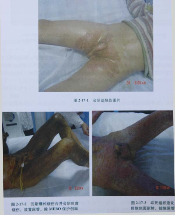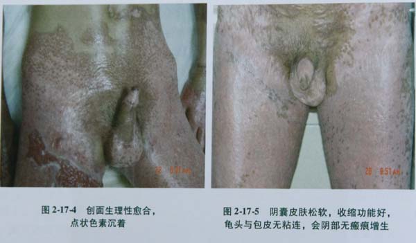 2172瓦斯爆炸致全身多處燒傷,合并會(huì)陰部Ⅲ度燒傷,常規(guī)安置尿管,耕耘清創(chuàng),直接將MEBO涂抹在會(huì)陰部;圖2173壞死組織不斷液化排除,創(chuàng)面新鮮,拔除尿管,鼓勵(lì)自解小便;圖2174創(chuàng)面生理性愈合,見點(diǎn)狀色素沉著;圖2175陰囊皮膚松軟,收縮功能好,包皮長度與傷時(shí)無明顯區(qū)別,皮膚仍松軟,可翻開,暴露龜頭,會(huì)陰部無瘢痕增生。