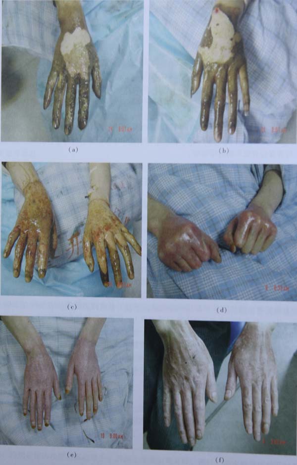 a)、(b)入院當時部分腐皮已脫,基底蒼白色,無明顯滲出及液化物,行耕耘、清創(chuàng);(c4天后,創(chuàng)面進入液化期,液化佳;(d)、(e)創(chuàng)面完成生理性愈合,無瘢痕增生,可完成握拳動作,皮膚可見皺折。(f)、(g)燒傷后109天,出院后回訪,手背色素沉著,手指膚色基本正常,皮膚彈性好,未見增生性瘢痕,功能不受限繼續(xù)美寶疤痕平治療。