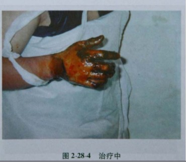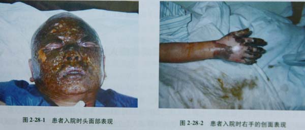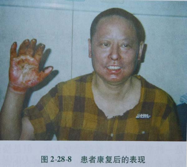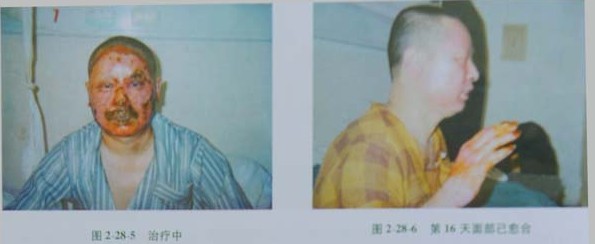 次日,患者頭面部腫脹明顯,散在小水皰,部分表皮脫落,基底紅白相間,痛覺遲鈍,鼻毛燒焦但拔毛有痛覺,右手表皮脫落,中度腫脹,活動障礙,手指焦黑收縮,手背呈蠟白色,痛覺消失。據(jù)此,對患者做出了進一步診斷:頭面部、右手燒傷合并輕度吸入性損傷(總面積約6%,淺Ⅱ度約2%、深Ⅱ度3%、淺Ⅲ度1%),并確立診療方案,規(guī)范各項操作技術(shù),患者第2天病情就有了明顯好轉(zhuǎn),雙眼、口唇腫脹明顯減輕,手指能適當活動。創(chuàng)面于傷后第10天愈合,右手背、指背的創(chuàng)面在傷后第16天基本愈合,右手功能將完全恢復(圖2287,圖2288)。