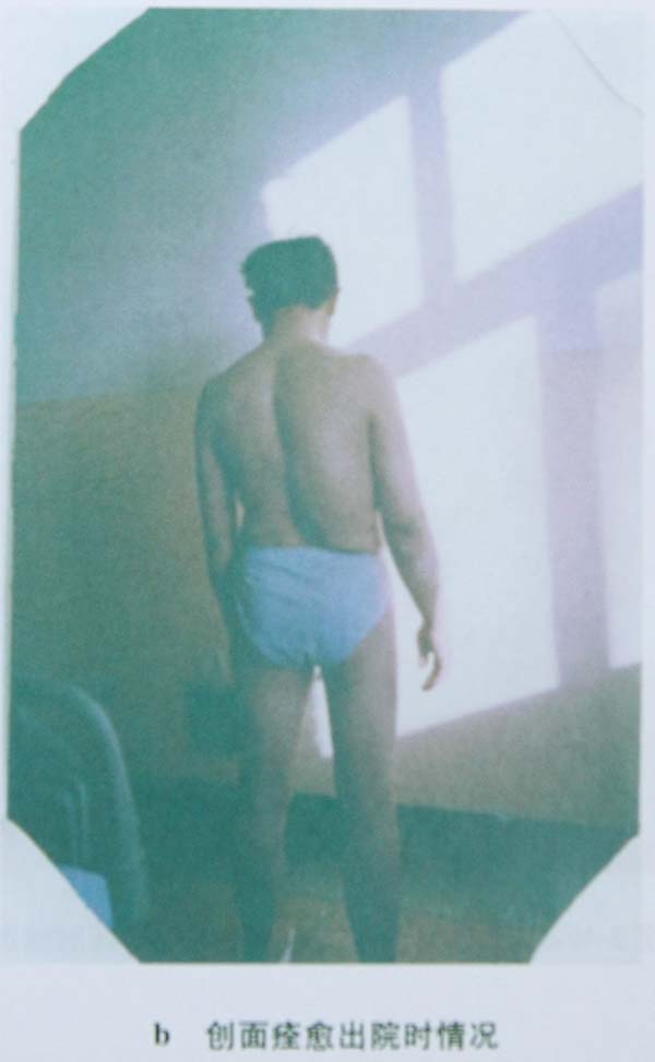 [病例3]患者賈××,36歲,石家莊市尼龍廠工人,住院日期200494日,出院日期20041130日,患者于工作中不慎從五米高處摔下,跌入電石爐中,造成全身堿燒傷,急入石家莊井陘礦務(wù)局醫(yī)院就診。入院診斷工業(yè)堿水全身Ⅱ—Ⅲ度燒傷總面積達(dá)92%TBSA(淺Ⅱ度40%,深Ⅱ度27%,Ⅲ度淺型10%,Ⅲ度深型15%)。即刻采用美寶濕潤(rùn)燒傷膏外涂保護(hù)創(chuàng)面,同時(shí)采取全身系統(tǒng)治療。包括強(qiáng)心、抗休克、抗感染、保肝、保腎、保護(hù)胃腸黏膜、持保水、電解質(zhì)平衡和酸堿平衡、營(yíng)養(yǎng)支持等綜合搶救措施,創(chuàng)面全程規(guī)范應(yīng)用燒傷皮膚原位再生技術(shù)和專用藥品美寶濕潤(rùn)燒傷膏?;颊哂谌朐汉?/span>24小時(shí),發(fā)生全身侵襲性感染,血常規(guī)WBC13×109/L下降到5×109/L、PLT147×109/L下降到8×109/L;肝功 谷丙轉(zhuǎn)氨酶高達(dá)362U/L,精神差,腹脹明顯,體溫395℃,呼吸淺快,36/分。心率快,134/分。口唇紫紺,創(chuàng)面灰暗,并見片狀出血點(diǎn),考慮為膿毒癥及并發(fā)肝、心等臟器功能不全。當(dāng)即給予高效、足量抗生素控制感染,加強(qiáng)心腦肝腎等臟器的支持保護(hù),對(duì)創(chuàng)面進(jìn)行徹底清理換藥。