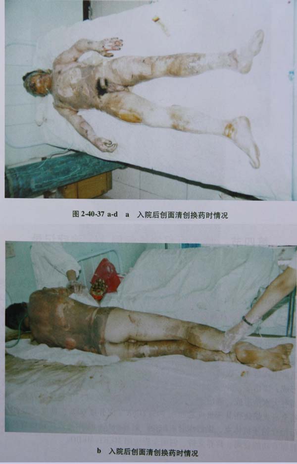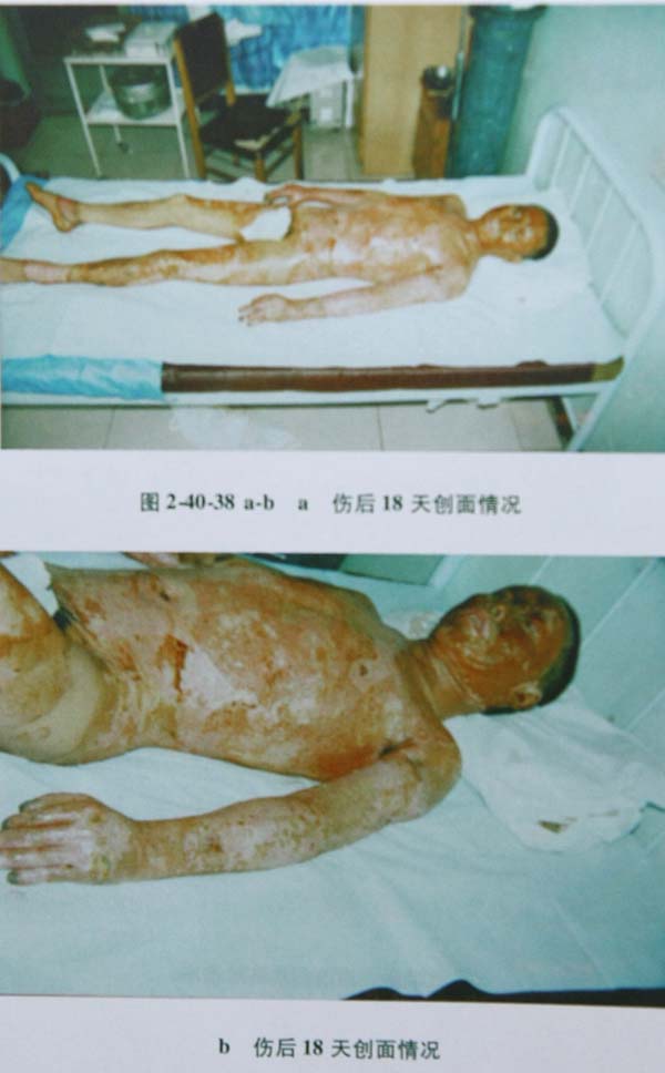 [病例4]患者李××,男,31歲,漢族,工人。以“面部、軀干、四肢火焰燒傷伴疼痛1小時”為主訴于2004年6月11日入院。入院查體體溫37℃,心率84次/分,呼吸22次/分,血壓110/96mmHg;發(fā)育正常,營養(yǎng)良好,神清語明,扶入病房,查體合作,全身皮膚撕脫,頭發(fā)燒焦,面部皮膚撕脫,基底蒼白,雙側(cè)瞳孔等大同圓,對光反射靈敏,頸軟,氣管居中,甲狀腺未觸及腫大,頸部皮膚撕脫,基底潮紅,胸廓對稱無畸形,皮膚部分撕脫,呼吸運動對稱,心律整,各瓣膜區(qū)未聞及雜音,腹平坦、軟、無肌緊張,肝脾肋下未觸及,腸鳴音正常,外陰及肛門未見異常,脊柱正常生理彎曲,腹部皮膚部分撕脫,基底蒼白,皮溫低,雙上肢皮膚撕脫,基底蒼白,創(chuàng)面有水皰形成,滲出多,腫脹明顯,皮膚如皮革樣改變,疼痛感覺減弱至消失,雙下肢皮膚部分撕脫,創(chuàng)面有大水皰形成,滲出多,腫脹明顯,疼痛感覺尚可;生理反射存在,病理反射未引出。入院診斷全身火焰燒傷Ⅱ—Ⅲ度總面積90%TBSA(深Ⅱ度60%,Ⅲ度淺型20%,Ⅲ度深型10%)入院后治療給予抗休克、強心保腎、抗炎、對癥治療、應(yīng)用高效廣譜低毒的抗生素、抗感染、預(yù)防多臟器官功能衰竭、營養(yǎng)支持、創(chuàng)面全程應(yīng)用MEBT/MEBO。