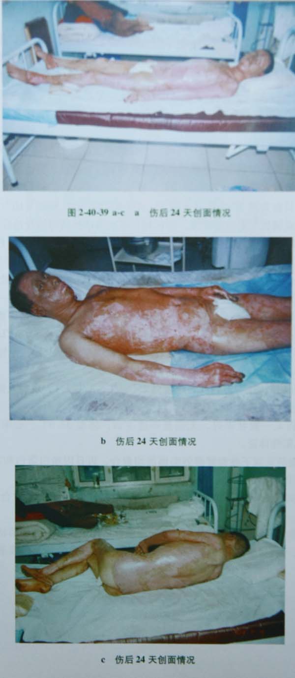 傷后第25天,換藥見雙下肢和背部創(chuàng)面創(chuàng)面均愈合,近日因輸白蛋白和加強營養(yǎng)支持療法,上皮再生較快,現(xiàn)存創(chuàng)面不足10%,創(chuàng)緣無炎癥反應(yīng)。