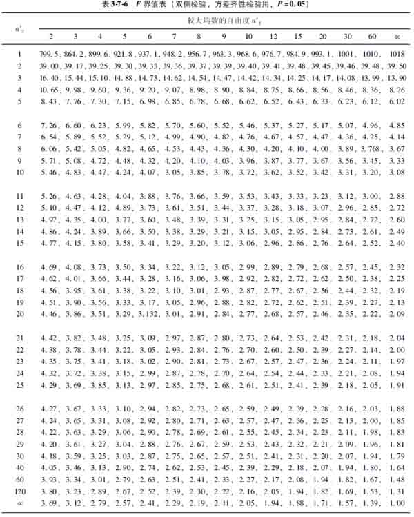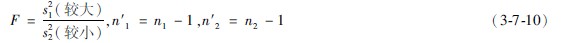 式中s21為較大樣本的方差,s22為較小樣的方差,相應的自由度分別為n′1和n′2,相應的樣本含量分別為n1和n2。由于恒取s21>s22,故F值必然大于1,求得F值后查F界值表(方差齊性檢驗用表,表376),得P值(F值愈大,P值愈小),作出結論。