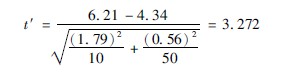 若兩個總體的方差不齊時,即σ21≠σ22時,兩小樣本均數的比較,可選擇以下方法:①采用適當的變量變換,使之達到方差齊的要求;②采用不要求方差齊的方法比較其分布,如秩和檢驗;③采用近似法t′檢驗,由于t′不服從t分布,故需要按公式(3710)求界值t(系近似值)。公式分別為:
