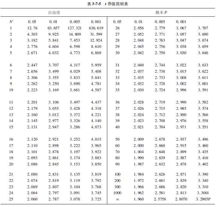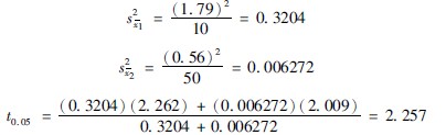 當確定檢驗水準α后,公式3712中的tα·n′1和tαn′2即可按n′1和n′2由表375查得,s2x1、s2x2分別為兩均數的標準誤的平方和。