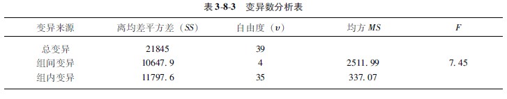 F值表上端的數(shù)值是較大均方的自由度,其符號(hào)為n1,左側(cè)的數(shù)值是另一個(gè)均方的自由度,其符號(hào)為n2。由本題變異數(shù)分析上表中較大的均方是251199,其自由度是4,故n1=4,又n2=35。查F值概率(P)005表(382),n1=4的縱行與n2=35的橫行相交處的數(shù)值,即265;查F概率(P)001表的數(shù)字為392。因注表中無35項(xiàng),用內(nèi)插法計(jì)算而得。表382(續(xù))數(shù)據(jù)相當(dāng)于概率(P)005的F值及數(shù)據(jù)相當(dāng)于概率(P)001F值。本例F值為745,大于392,即F>001,故P<001。