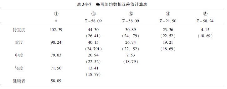 將所計(jì)算的兩均數(shù)相差界限顯著界值(Q×sx)填入表388中的②、③、④、⑤欄相應(yīng)數(shù)字的下方。