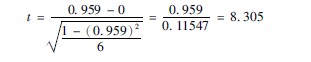 本例自由度為(n′)為6, P005界值為2447,P001界值為3707,本例t=8305,不僅大于2447,也大于3707,故P<001,即相關(guān)系數(shù)非常顯著。