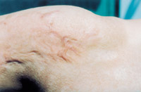7.淺Ⅲ度創(chuàng)面(右大腿及膝關(guān)節(jié)外側(cè))自行愈合后3年,少量瘢痕平整柔軟,無增生,少量色素缺失,皮膚彈性好,不影響功能
