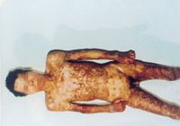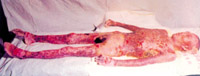 治療后 四肢微粒皮移植術后,創(chuàng)面封閉(胸、手、背、腳背脫痂后晚期植皮,尚有肉芽創(chuàng)面殘存)