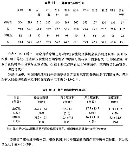 由表5-15-3看出,兩組病人重度和特重度燒傷均占較高比例,即治療組燒傷總面積大于50%BSA者,或是Ⅲ度燒傷面積超過(guò)20%BSA者已達(dá)75例;對(duì)照組31例,分別占各組例數(shù)的20.7%和21.3%,或者說(shuō),兩組重度以上燒傷病例已超過(guò)或接近總例數(shù)的40%。他們中最大燒傷面積者達(dá)94%BSA,同時(shí)Ⅲ度面積達(dá)73%BSA。由此說(shuō)明,無(wú)論是治療組還是對(duì)照組,傷情都是相當(dāng)嚴(yán)重的,而目前在國(guó)內(nèi)外的治療難度也是相當(dāng)大的。