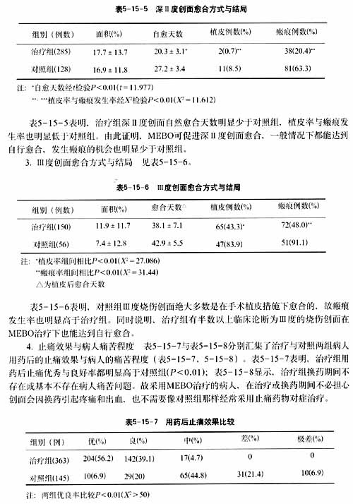 7. 大面積燒傷病人的療效 本研究508例病人中,以傷情分類標(biāo)準(zhǔn)(見(jiàn)表5-15-3)劃分,總燒傷面積大于50%TBSA的大面積燒傷病人共106例,占總病例數(shù)的20.9%,其中治療組75例,占大面積燒傷病人的70.8%(75/106),他們中一例最大燒傷面積達(dá)94%TBSA,同時(shí)III度面積達(dá)73%TBSA,如此嚴(yán)重?zé)齻∪藝?guó)內(nèi)治愈者是屈指可數(shù)的。對(duì)照組大面積燒傷31例,占大面積燒傷總例數(shù)的29.2%(31/106)。然而,兩組病人的治療效果截然不同。對(duì)照組死亡2例,最終因留有大于5%TBSA殘余創(chuàng)面而判為好轉(zhuǎn)者18例,因此對(duì)照組的治愈率僅為73.7%,好轉(zhuǎn)率為24.0%,死亡率為2.3%;而治療組全部治愈。同時(shí)指出,對(duì)照組有近半數(shù)病人由于SD-Ag療法效果欠佳而中途改用了MEBO治療。據(jù)此又可說(shuō)明,對(duì)照組能有73.3%的治愈率,與MEBO能補(bǔ)救SD-Ag的某些缺欠也有很大關(guān)系。治療組全身同時(shí)應(yīng)用MEBO治療的創(chuàng)面面積已遠(yuǎn)遠(yuǎn)超過(guò)人體總面積的50%,而且是全程治療,且未發(fā)現(xiàn)病人有任何不良反應(yīng),說(shuō)明MEBO在大面積燒傷病人中應(yīng)用是安全的。