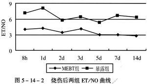 (1) 血漿ET、NO測(cè)定結(jié)果:正常人血漿ET值42.8±12.2pg/ml,NO值14.5±3.6mol/L,ET/NO之比約為2.95。表5-14-3見(jiàn)兩組傷后8h血漿ET迅速上升,但MEBT組在各時(shí)相上升水平均低于干燥暴露療法組,5天后恢復(fù)到正常水平,干燥暴露療法組在傷后14天仍維持較高水平。表5-14-4見(jiàn)兩組傷后8h血漿NO均迅速上升,1天起MEBT組逐漸下降,3天后恢復(fù)到正常水平,干燥暴露療法組7天后才恢復(fù)到正常水平。圖5-14-2見(jiàn)MEBT組1天后ET/NO就趨向于2.95,而干燥暴露療法組各時(shí)相ET/NO遠(yuǎn)高于2.95。