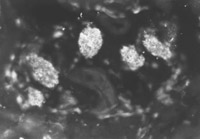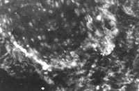 2. 生物素—抗生物素蛋白DCS體系間接免疫熒光染色 先將冰凍切片用10%的馬血清于4℃孵育20min,然后滴加1:20稀釋的小鼠抗人角蛋白19型單克隆抗體(第1抗體)4℃孵育過夜。切片在磷酸緩沖液中涮洗后加第2抗體,即7.5礸/ml生物素化的馬抗小鼠IgG抗體(Vector Laboratories Burlingame, CA, USA),4℃孵育1h。涮洗后,加10礸/ml熒光素-抗生物素蛋白DCS(Vector Laboratories Burlingame, CA, USA)于4℃孵育1h。將切片涮洗干凈后,用含10%PBS和1%對苯基二胺(P-phenylenediamine)的甘油做介質(zhì)封片。對照染色切片,則不加第1抗體。標本在Olympus反射式熒光顯微鏡下觀察,并用ASA400 KODAK膠卷照相。