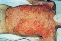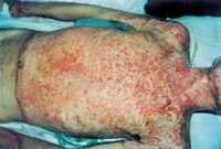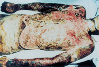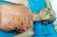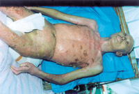 入院后即快速補液糾正休克,行氣管切開,改善通氣功能,左前臂、雙小腿Ⅲ度環(huán)形焦痂切開減張,改善肢端血運。上腔靜脈穿刺置右心漂浮導(dǎo)管行心功能各項指標(biāo)監(jiān)測。于傷后第二天行四肢切痂微粒植皮,傷后第六天行胸腹部切痂植大張開洞異體表,傷后10天(術(shù)后4天)胸腹部嵌植小片自體皮?;颊邆?8天出現(xiàn)嚴(yán)重綠膿桿菌敗血癥,持續(xù)低溫昏迷一周,經(jīng)全力搶救,敗血癥得以控制;又先后9次行植皮手術(shù),大部創(chuàng)面封閉;曾于傷后43天出現(xiàn)左眼角膜潰瘍,以點眼、球后結(jié)膜下注射等治療,潰瘍愈合。住院期間為預(yù)防應(yīng)激潰瘍,控制感染,防止肺部并發(fā)癥等,亦采取了相應(yīng)的措施。共住院70天。
