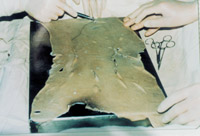 3-8 將異體皮拉網(wǎng)式覆蓋在手術(shù)后的創(chuàng)面上。4天后將自體皮切成碎粒(或片)嵌入異體皮的網(wǎng)洞內(nèi)