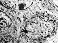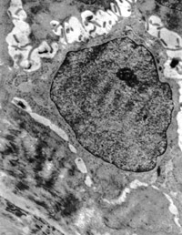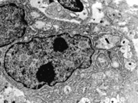 5-2-8 傷后第10天,皮膚附件上皮細(xì)胞成簇分布,核仁邊集,內(nèi)質(zhì)網(wǎng)擴(kuò)張,胞質(zhì)內(nèi)含較多張力原纖維  TEM×6000