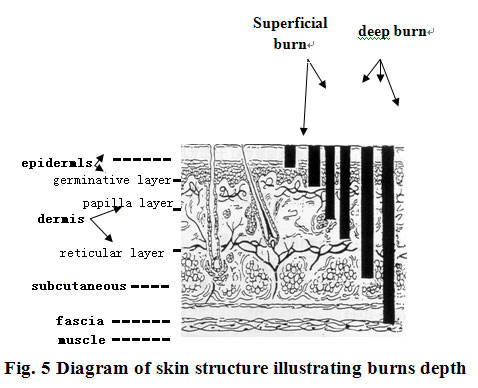 People usually classify burn depth according to the penetration of anatomical structure. i.e. superficial, partial and full-thickness burns. Burns are also classified into three degrees by numbers: first-degree burns, only superficial cell layer is involved; second-degree burns involves basal layer of the epidermis and superficial layer of the dermis, while third-degree burns involves subcutaneous tissue. According to wound manifestation and healing, deep burns wounds can be divided in an even more detailed manner. Second-degree burns can be divided into three grades: Superficial second-degree burns refers to burn injury reaching the basal layer of epidermis with some of the basal layer is still surviving. Superficial deep second-degree burns refers to burn injury reaching the dermal papillary layer while deep second-degree deep burns refers to burn injury reaching the dermal reticular layer. The theoretical basis is that in superficial second-degree burns wounds, the skin microcirculation has been injured but there is no stasis zone and most of the skin structure is retained. In deep second-degree burns wounds, the stasis zone occurs in the dermal papillary layer but epidermal structure is lost while most of the skin appendages are still retained. In deep second-degree deep burns wounds, a microcirculation stasis zone is formed in the dermal reticular layer and only a small part of the appendages is retained.